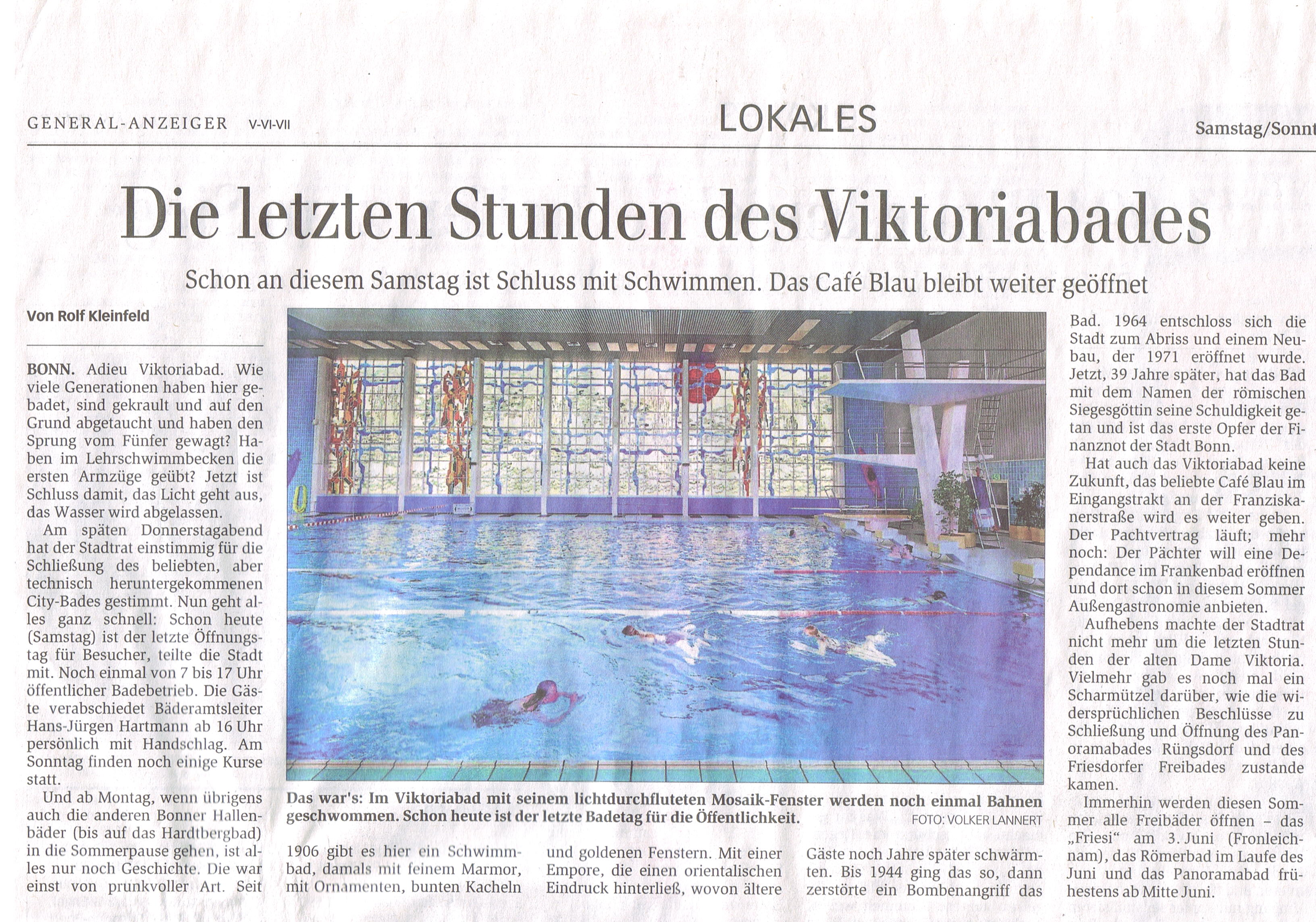 Der Rat der Stadt Bonn hat am 31. Januar 2007 beschlossen, im Rahmen des städtischen Bäderkonzeptes das Viktoriabad in drei Jahren zu schließen. In der Tat wurde das Bad am Samstag, 29. Mai 2010, »für immer geschlossen«: »Das Gelände soll zukünftig kommerziell genutzt werden: ›Wahrscheinlich wird es eine Ausschreibung geben‹, so [Bäderamtsleiter Hans-Jürgen] Hartmann, ›ich tippe auf eine Erweiterung der Fußgängerzone, die Lage ist attraktiv für den Einzelhandel.‹« schreibt dazu der General-Anzeiger.